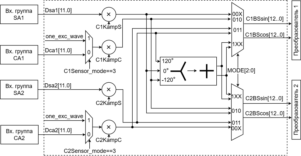 Блок масштабирования позволяет изменять масштаб сигналов после аналого-цифрового преобразования. Масштабирование предназначено для коррекции ошибки усиления ALIT и аналоговых цепей на плате, а также погрешностей датчика. Масштаб сигналов задается в регистрах C1KampS (вход IOSA1), C1KampC (вход IOCA1), C2KampS (вход IOSA2), C2KampC (вход IOCA2). Значения по умолчанию в этих регистрах предполагают сигнал на входе микросхемы амплитудой 2,5 В (пик-пик). Блок производит преобразование координат из 3-х фазной системы координат в декартову систему координат для режима Сельсин. Выбор режима Сельсин производится установкой Mode[2:0]=4 (регистр AFE_config). В данном режиме используются входы, приведенные в таблице 5.