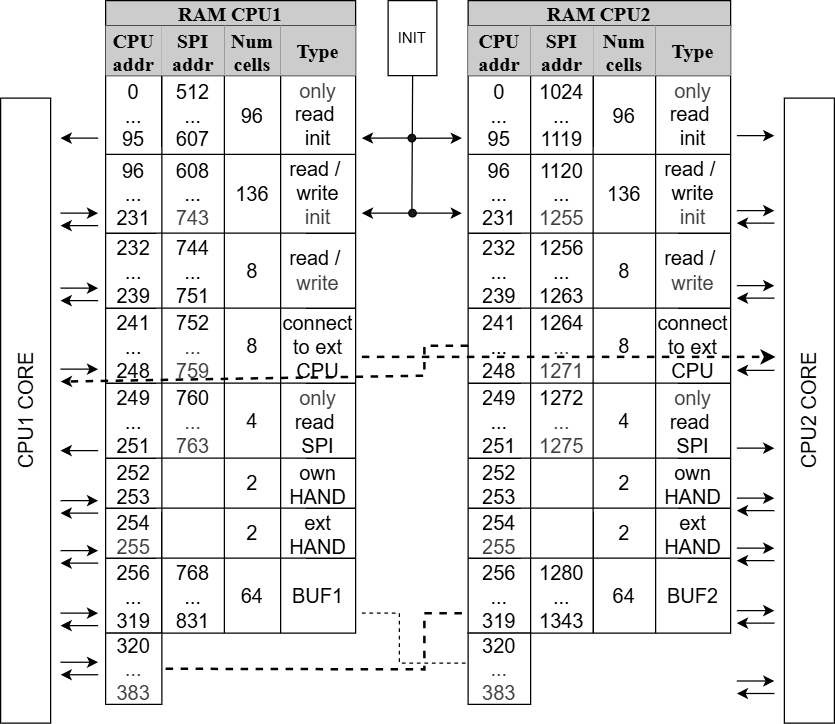 При включенной функции инициализации (бит INIT_on) в первые 232 ячейки обоих CPU переписываются данные из ПЗУ с последовательным доступом. В остальные ячейки с адресами доступными для записи\чтения по SPI записываются нули. Первые 96 ячеек доступны только для чтения ядром CPU. Ячейки с адресами в диапазоне [96 ... 239] доступны как для чтения, так и для записи.