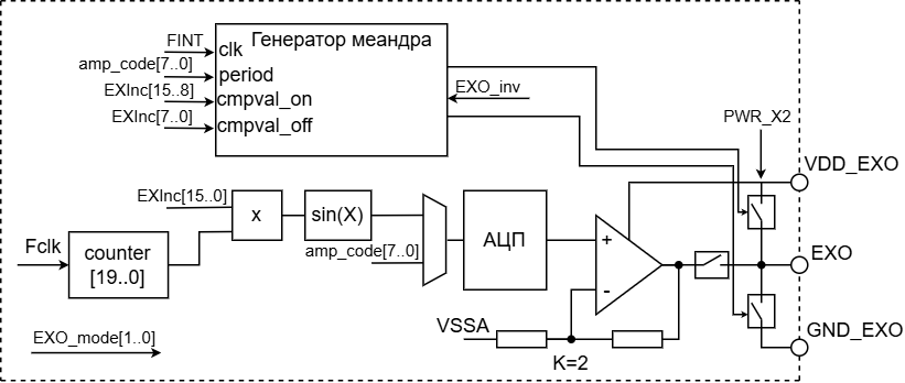 EXO_mode = 00— генератор выключенEXO_mode = 01— вывод синусоидального сигналаEXO_mode = 10— вывод импульсного сигналаEXO_mode = 11— вывод постоянного уровня