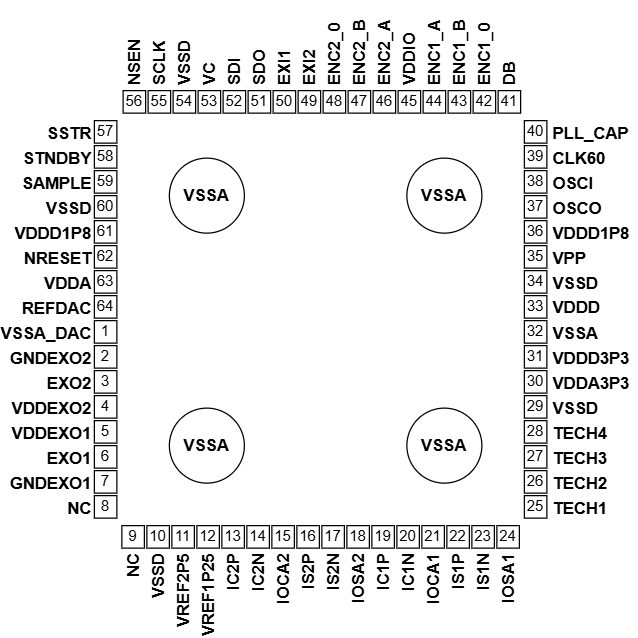 | 63 | VDDA | PWR | Вход линейного регулятора напряжения питания аналоговой части |