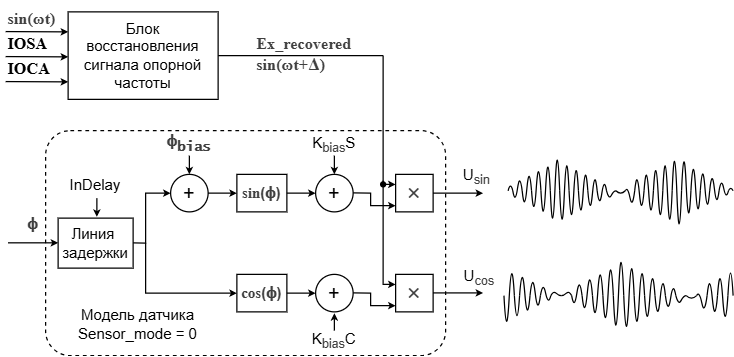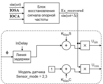 - InDelay – фиксированная дополнительная погрешность к групповой задержке сигналов в фильтрах на плате и в датчике. Основная часть групповой задержки сигнала Uex в фильтрах и датчике имитируется с помощью операции восстановления до Ex_recovered в блоке восстановления сигнала опорной частоты.