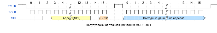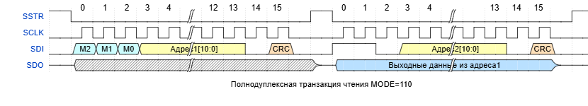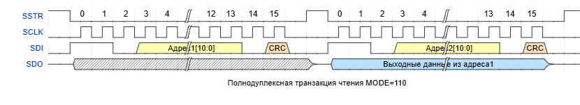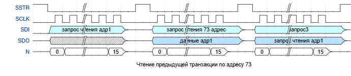 - прием на SDI командного слова и одновременная выдача на SDO данного по предыдущему адресу