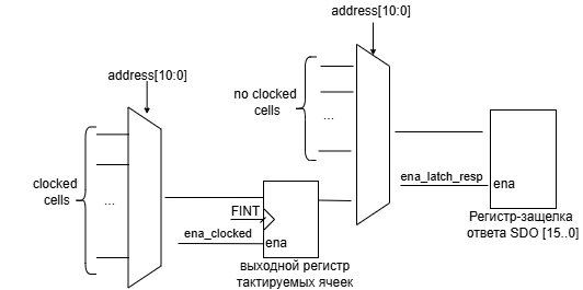 Для тактируемых FINT ячеек выход мультиплексора подключен к промежуточному регистру. Разрешение копирования данных на него снимается "ena_clocked' при заднем фронте SSTR или 16-м заднем фронте SCLK (при непрерывной циклической передаче). Сигнал "ena_clocked' (см. рис.##) пересинхронизируется двумя триггерами на FINT, что требует паузы до первого фронта SCLK длиной в 3 периода FINT (параметр данной задержки конфигурируется в большинстве архитектур микроконтроллеров).
