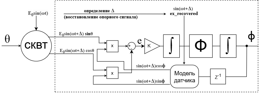 Полученное после первого интегрирования значение является разницей между истинным положением ротора и вычисленной следящим контуром координатой, и это значение получено без проведения вычислений, обратных к функции СКВТ. Модель функции СКВТ в обратной связи может быть усложнена параметрами и естественными искажениями порожденных сигналов в целях увеличения соответствия виртуальных к реальным сигналам с датчика.