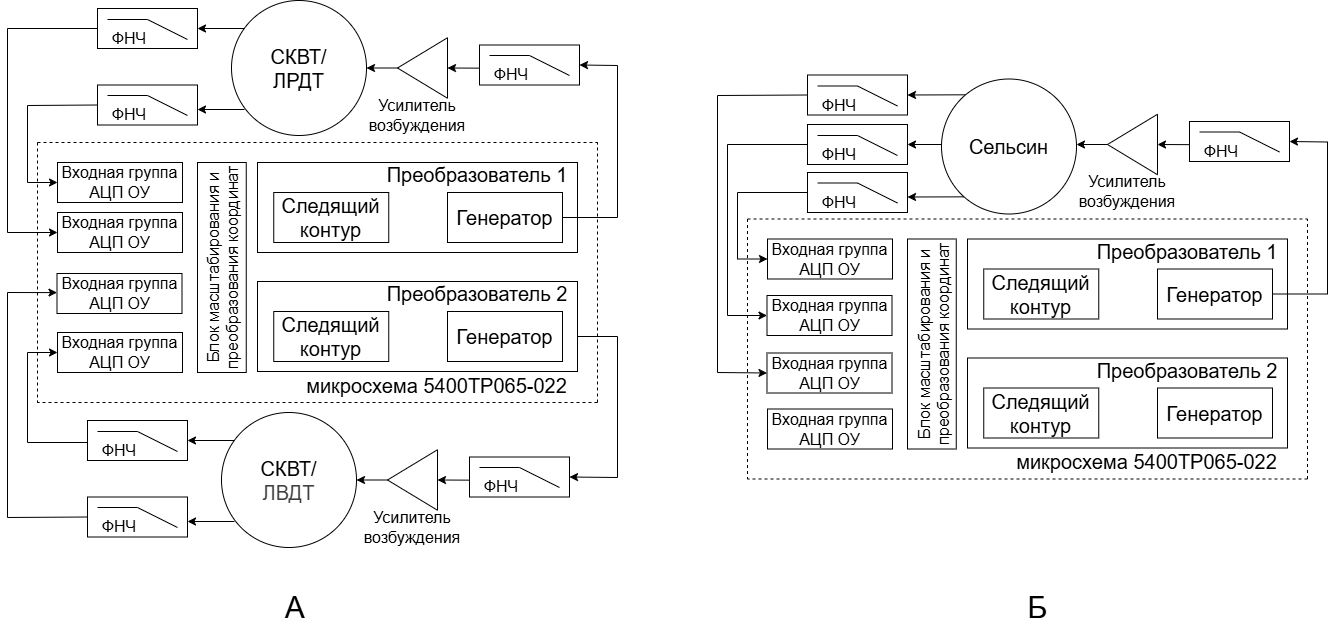 Микросхема содержит два независимых блока преобразователя координата/код (далее “преобразователь 1” и “преобразователь 2”), которые могут использоваться как независимо, так и совместно для повышения точности или надежности преобразования. В обозначении регистров, принадлежащих каждому преобразователю, используется префикс “C1” и “C2“ соответственно. Каждый блок преобразователя реализует следящий принцип измерения. Для подачи возбуждающего напряжения на датчик микросхема содержит два генератора сигналов возбуждения датчиков. Сигналы с вторичных обмоток датчика преобразуются в цифровую форму и подаются на вход преобразователя, который осуществляет нахождение координаты, используя виртуальную модель датчика и контур с обратной связью.